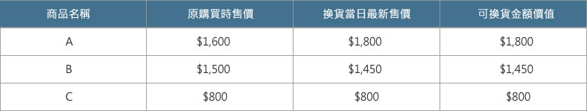 由於業界商品價格波動迅速,換貨金額以換貨當日商品最新價格為準(範例如下)