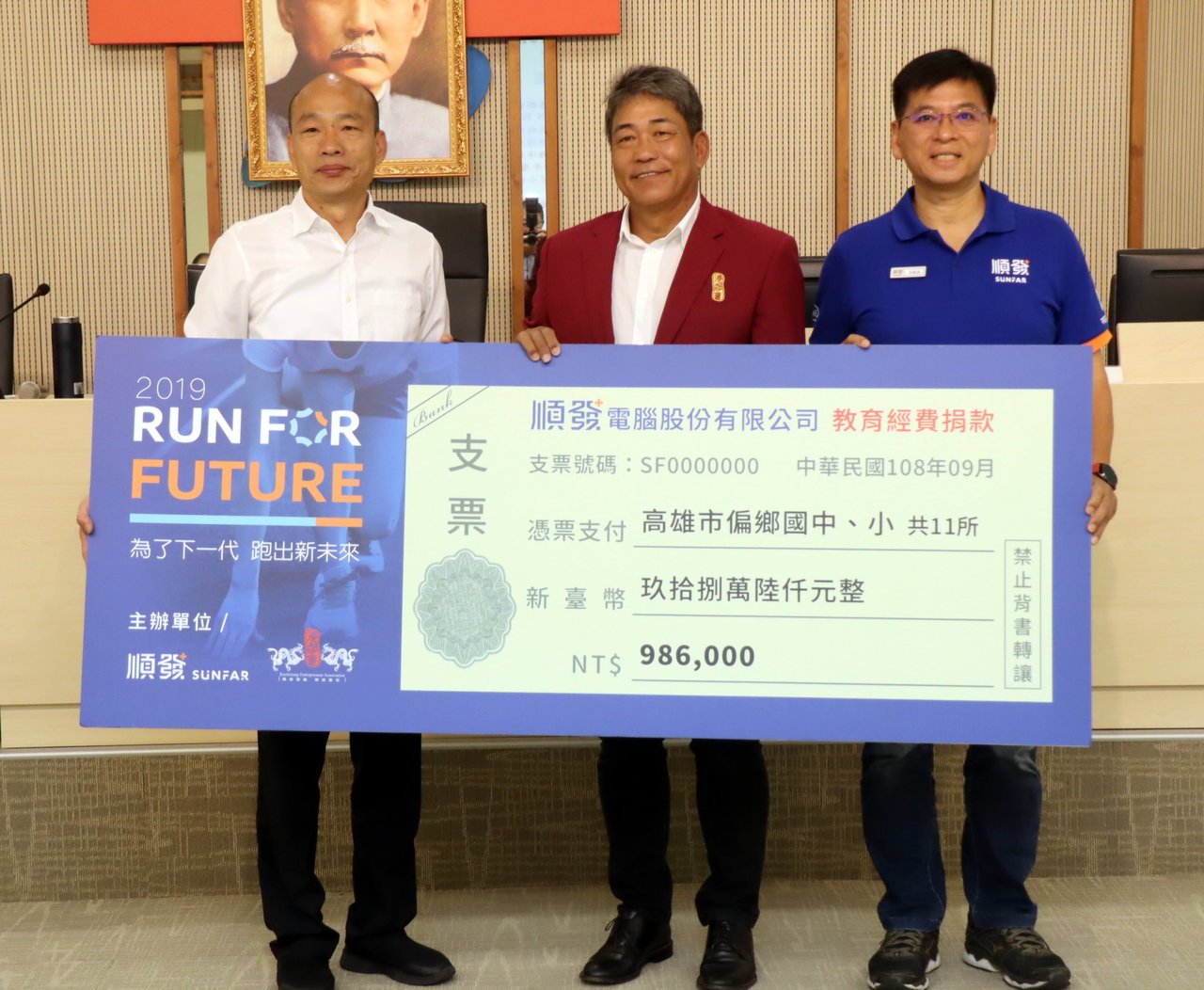 高雄市長韓國瑜今天在市政會議上,代表受贈港都會與順發3C共同舉辦「2019 RUN FOR FUTURE」公益路跑活動結餘款,共98萬6000元,9月撥入那瑪夏、茂林與桃源區等11所國中、小,善款將運用於學生學習、相關教學教材、設備上。