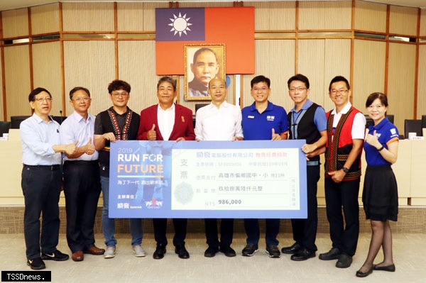 今年四月十四日港都會與順發電腦聯手在世運主場館主辦「2019 Run for Future」公益路跑,秉持著路跑開辦宗旨,活動結餘款九十八‧六萬全數捐給高雄市偏鄉學校,用來幫助弱勢兒童就學所需;昨(十七)日於高市府舉辦頒獎儀式,由市長韓國瑜頒發感謝狀給主辦單位港都會和順發三C。(見圖)