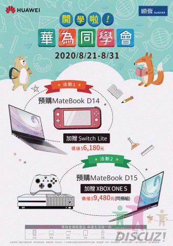 為讓學生們有更優質的學習體驗,順發特別加碼應援豪禮,陪學生們一起歡樂迎接開學!即日起(8/21)~ 8/31於順發完成預購HUAWEI MateBook D系列美型筆電,就可以將Nintendo Switch Lite(建議售價$6,180元)或 XBOX ONE S 同捆組(建議售價$9,480元)開學應援豪禮帶回家!買華為到順發,眾多豪禮獎不完!