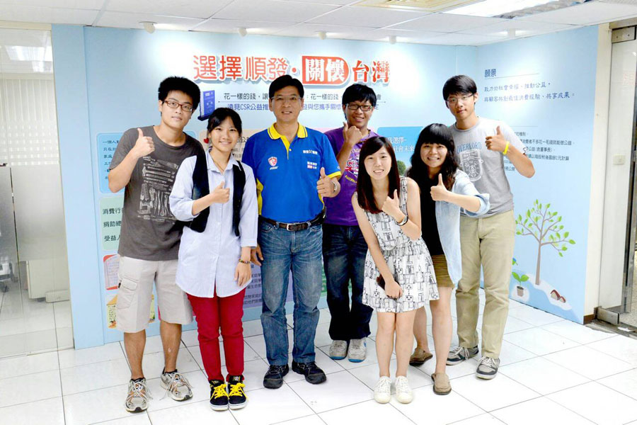 社會企業創思社社員及吳錦昌學長,攝於順發「公益牆」前 初見吳學長時,其實不會讓人覺得很有距離感,與其說學長是上市公司的董事長,倒不如說他比較像是一名慈眉善目的「傳教士」,到處傳播「支持公益」的福音給社會大眾,而社會企業創思社的成員正是受感化的信徒,兩方相談甚歡,好不痛快。