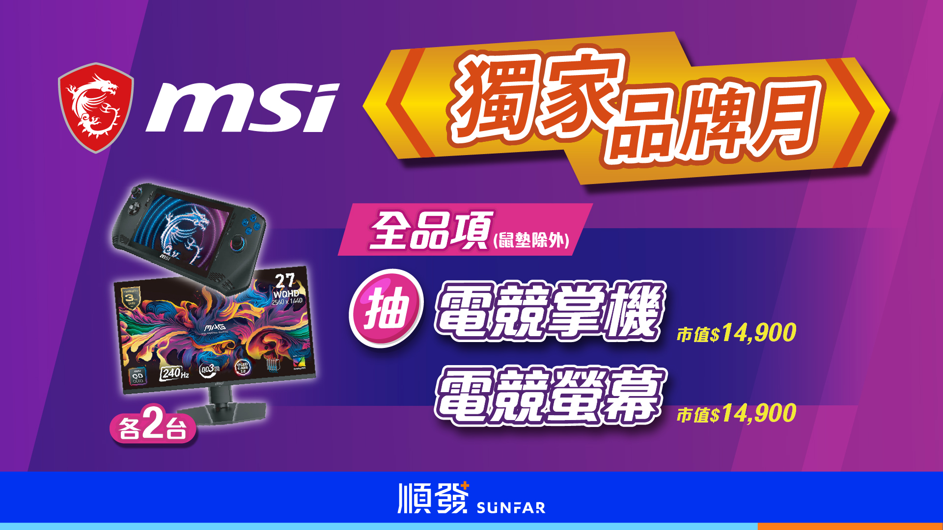微星品牌月 這波真的狠全台只有順發玩這麼大——買MSI全品項(鼠墊除外)抽MSI Claw A1M-027TW電競掌機(市價$14,900) 2台MSI MAG 271QP QD-OLED X24電競螢幕(市價$14,900) 2台遊戲時享受擬真沉浸畫面工作娛樂兩用強悍配置這檔一次幫你搞定重點來了——#順發獨家 別想去別的地方找 沒有手刀下單 ➜ https://sf3c.tw/wj8e9